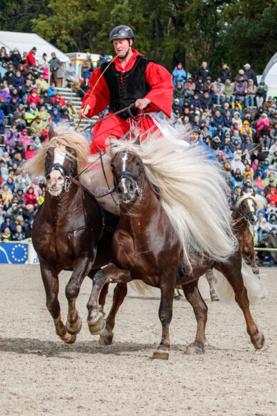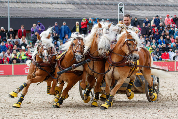 Other displays were a lot louder, especially when four Roman quadrigas rocked the arena. As the chariot drawn by four Haflingers charged around the arena at full speed, no one remained in their seats and Mexican waves surged through the audience – the atmosphere was electrifying!