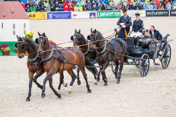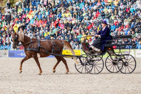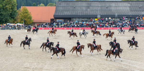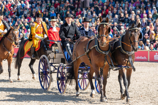 When the new show arena was opened in 1978, the event was marked by the first appearance of a ten-in-hand. For the 2025 anniversary, no less than six ten-on-hands entered the arena, each carriage drawn by a different breed of horse: Warmbloods, Black Forest draft horses, Norikers, Haflingers, Freibergers, and Sports Ponies. What a grand display of driving skill – sixty horses in harness filling the arena, a sight never to be forgotten!