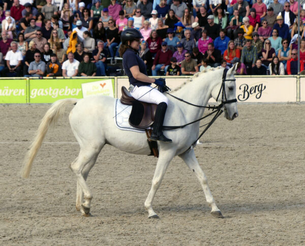 Horses can do many things: they can be sports partners or leisure time companions, and they can also be therapists. Patients from the Hippo- and Physiotherapy Centre Scharnhausen gave a display of therapeutic riding, demonstrating how well horses can adapt to handicapped riders. The horses included the 2013 Marbach-bred purebred gelding WM Saradan (Said x Shafali), who carried his rider safely through the quadrille. The speaker asked the audience for ‘silent applause’ for this display, which means waving instead of clapping, to ensure the safety of horses and riders.
