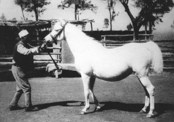 Thanks to the late Carol Lyons’s collection of historical material, the correspondence of the American Jack Humphrey’s trip to Egypt in February 1932 provides some insight into this splendid mare Serra. Jack Humphrey was acting as agent for the American Arabian breeder W R Brown. When Humphrey was visiting Prince Kemal El Dine, he discovered the mare Serra. He was immediately impressed not only with her overall quality, but also of the quality of her produce regardless of sire. Describing Serra he noted: ‘… an old white mare, heavy in foal to Rustem. This is the outstanding animal in the Stud… I tried hard to get a price on her but nothing doing.’ (1) Several years later, H E Fouad Abaza Director of the Royal Agricultural Society (RAS), while visiting the Sidi Salem Stud of T G B Trouncer, remarked in a later report: ‘…Sit Serra was renowned as being one of the best mares in the land of the Pharoahs.’ (2) Both men were very impressed with Serra and her produce.