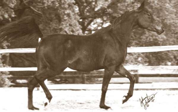 It is interesting that Serra’s son Zareef (ex Rustem) managed to also carry Serra’s blood into modern day Egyptian breeding through just one daughter, Atlus, who produced Fadila, a 1946 grey sired by the great Sheikh El Arab, sire of Halima and other important mares in Egypt. Fadila had only one daughter that carried forward, the 1966 chestnut mare Naglaa (ex Mamdouh), foaled when Fadila was 20 years old. Were it not for Naglaa, the line to Zareef would have certainly died out. Naglaa was then exported from Egypt to Germany in 1971 producing 14 foals, mostly daughters. Three of Naglaa’s daughters came to the US, Nashakla (AK Nashakla), Naglaana, and Chrymont Nasirah. This last mare did not produce, but Nashakla and Naglaana did. Both were sired by Shaker El Masri, sire of the legendary El Shaklan. Both left produce in Europe before being exported to the US, with Nashakla and Naglaana both described as chestnut mares of good size and excellent movers. Several of Naglaana’s produce were also later imported to the US. David Myers, of Renaissance Egyptian Arabians, remembers Nashakla as a tall chestnut mare with lots of roaning in her coat and a great mover. Jody Cruz of Rancho Bulakenyo acquired Naglaana’s daughter Maligana (ex Malik) and describes her as a really beautiful mare with huge black eyes, pretty head and ears, also well bodied and correct. Both Naglaa daughters have descendants in the US winning in performance classes. Naglaa’s influence has remained prominent in Europe as well predominantly through her daughters, all being quite prolific.