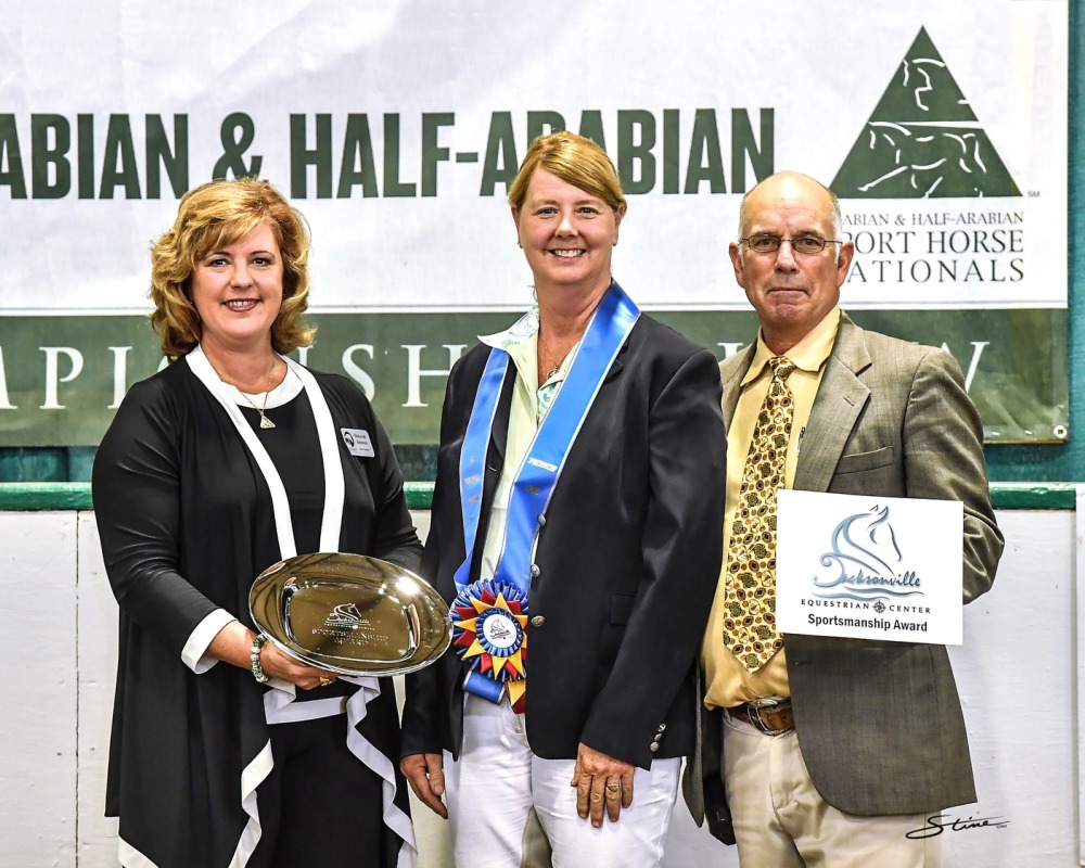 Raleigh, NC (October 10, 2017) – The 2017 Sport Horse National Arabian and Half-Arabian Championship Show held in Raleigh, North Carolina was among the many events along the eastern U.S. coast faced with the forecast of Hurricane Irma this season. Luckily, when warnings sounded, quick-thinking competitors pulled together to keep the horses safe and ensure that the show could still go on. Kristi Herbst, one of these competitors, was rewarded for her willingness to pitch in with the Jacksonville Equestrian Center Sportsmanship Award. The award was presented by the Jacksonville Equestrian Center, a multifaceted equestrian show facility and a sponsor of the Arabian Championships.