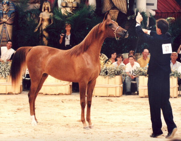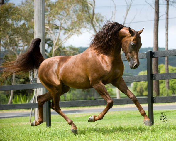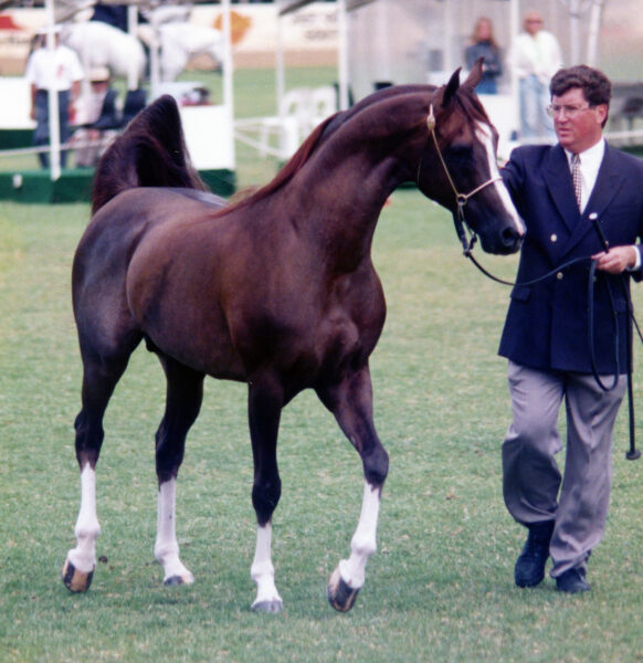 Phenotypically, Fame Maker exemplified the breed ideal more so than any chief sire in Mulawa’s long history. His silhouette – superbly balanced and harmoniously proportioned, with an elegant upright forehand, a compact level topline and an undeniable aristocratic elegance – was remarkably reminiscent of his maternal grandsire El Shaklan (Shaker El Masri x Estopa by Tabal), the iconic sire of unparalleled global influence whose monumental influence in Australia had yet to be incorporated into the Mulawa breeding programme. Fame Maker’s exceptional conformational correctness, strong, smooth coupling and powerfully impulsive, brilliantly animated athleticism can be credited to his paternal grandsire Raffon (Gazon x Vadraff by Indraff), a United States National Champion Stallion and English Pleasure Horse responsible for so much genetic merit in the breed worldwide. Fame Maker’s uber-abundance of irresistibly compelling charisma and imposing, overwhelmingly extroverted self-confidence, along his reliably exuberant tail-carriage – carried at full mast in flag unfurled style whenever he was in motion, were the irrefutable gifts of his paternal grandsire Bey Shah (Bay el Bey x Star of Ofir by Bask), whose profound legacy has enriched the breed inestimably. Fame Maker’s final genetic connection of consequence was his maternal granddam Prometida (Zanjar x Batista by Sherif), a straight Spanish mare discovered in 1970 by Sigi Siller on her first trip abroad in search of quality bloodstock, who became one of the foundation mares at Om El Arab alongside the legendary Estopa (Tabal x Uyaima by Barquillo).