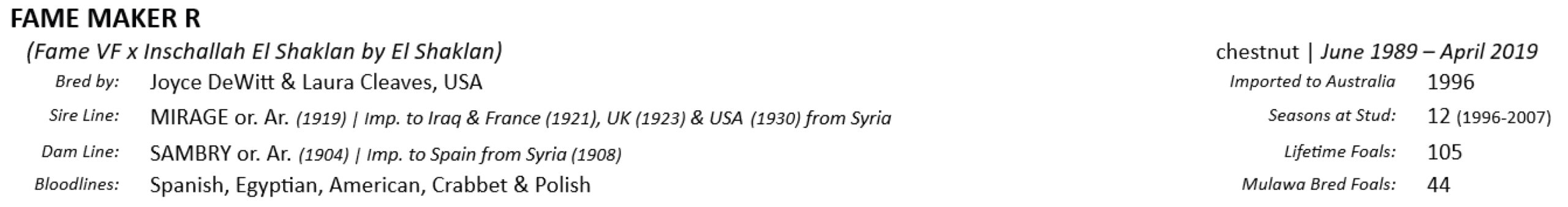 For almost two decades, Fame Maker was an incredibly reliable source of superlative show horses, both in hand and under saddle, as well as invaluable breeding horses, especially his prolific daughters. Two-time Australian National Reserve Champion Fames Harmony, his most look-alike daughter, proved an ideal cross with Klass (TS al Malik x Karmaa by Kaborr), producing several daughters of monumental importance in turn. The cross of Fame Maker daughters with Klass became a reliable nick for Mulawa in the 2010s, resulting in three-time Australian National Champion Klassical Fame MI (ex Forever Fame).